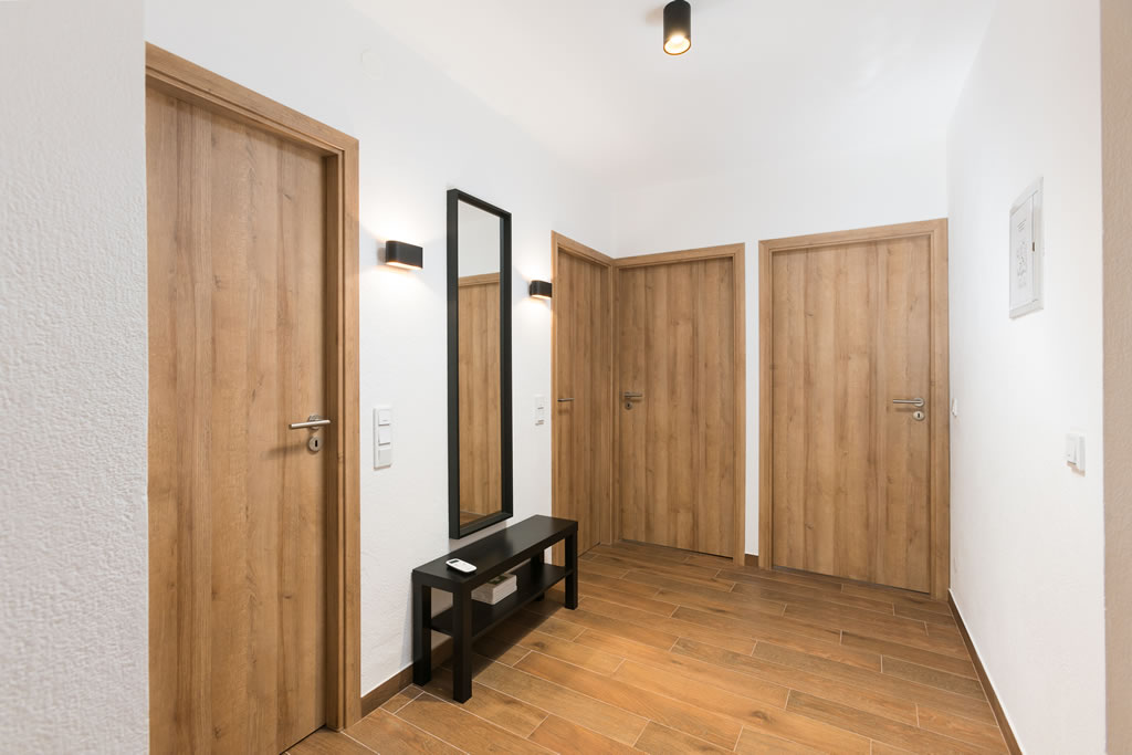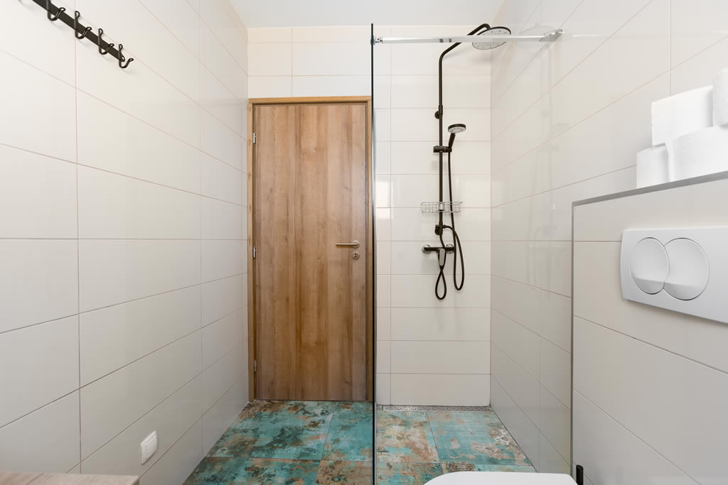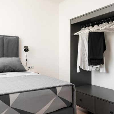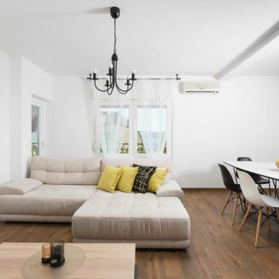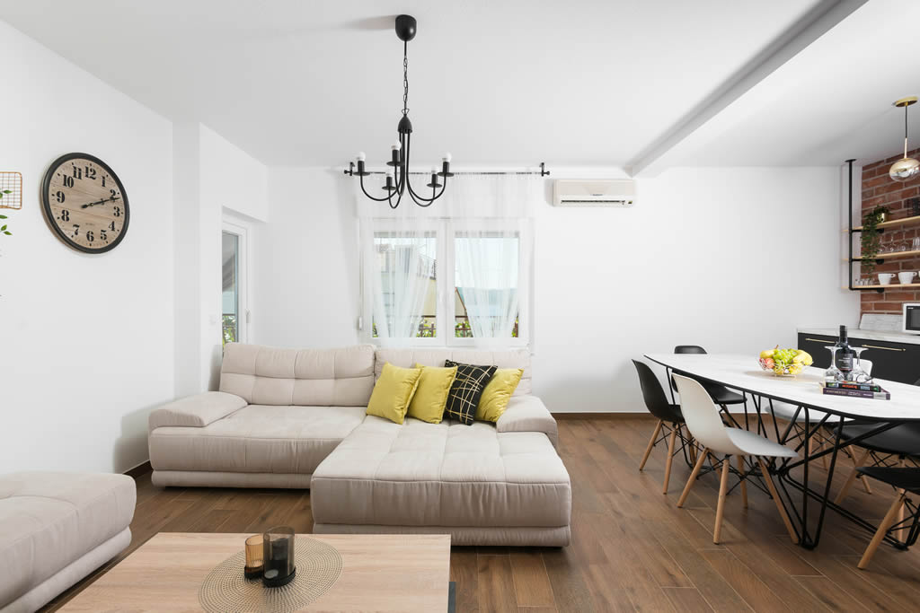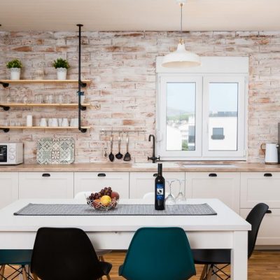 We offer you two large and spacious apartments, each of the size of 100 m2 suitable for 8 people. Apartment Regius Black is on the first floor and our Regius White is on the second floor. The apartments have the same room layout and size, the only difference is in decoration, style and colour. Each apartment has three bedrooms, 2 bathrooms, an open concept living room with a fully equipped kitchen including a dishwasher. The apartments are air-conditioned. The living room area has an exit to a terrace and balcony with a stunning view on Čiovo bay, especially from the second floor.