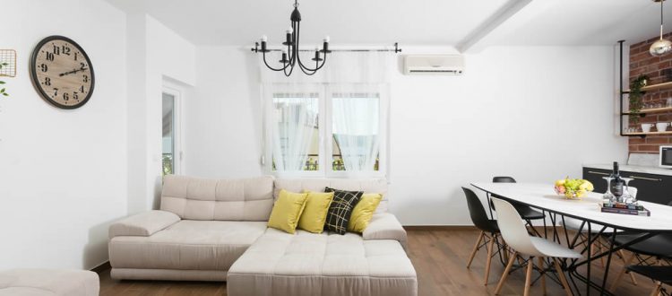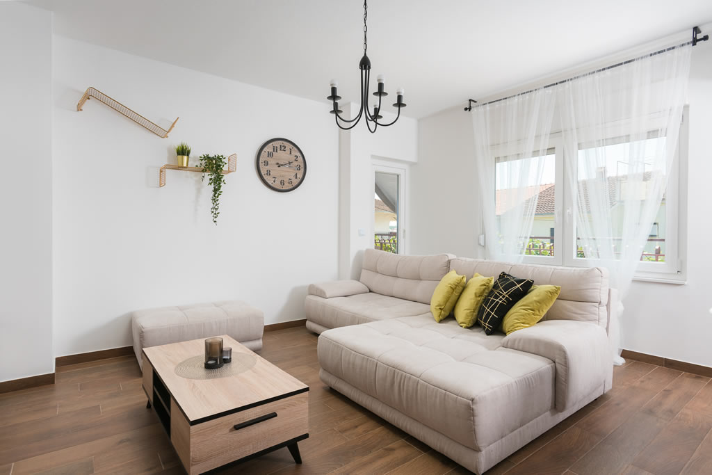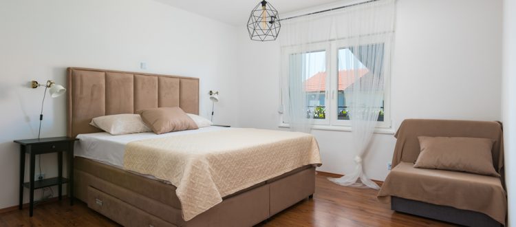 We offer you two large and spacious apartments, each of the size of 100 m2 suitable for 8 people. Apartment Regius Black is on the first floor and our Regius White is on the second floor. The apartments have the same room layout and size, the only difference is in decoration, style and colour. Each apartment has three bedrooms, 2 bathrooms, an open concept living room with a fully equipped kitchen including a dishwasher. The apartments are air-conditioned. The living room area has an exit to a terrace and balcony with a stunning view on Čiovo bay, especially from the second floor.